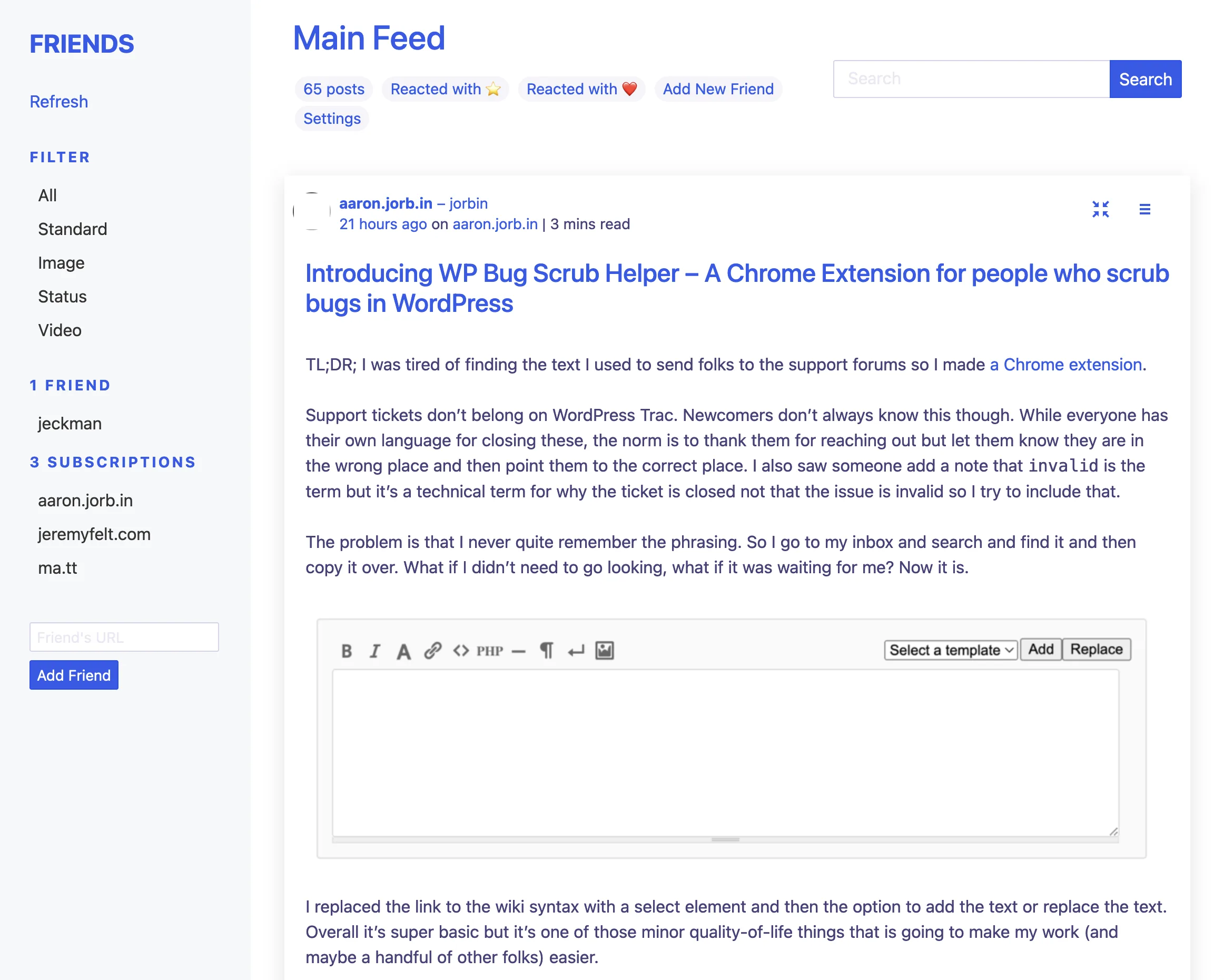 Do you use the Friends plugin? How have you customized your feeds page or content subscriptions? You can add yourself to my friends list here!
