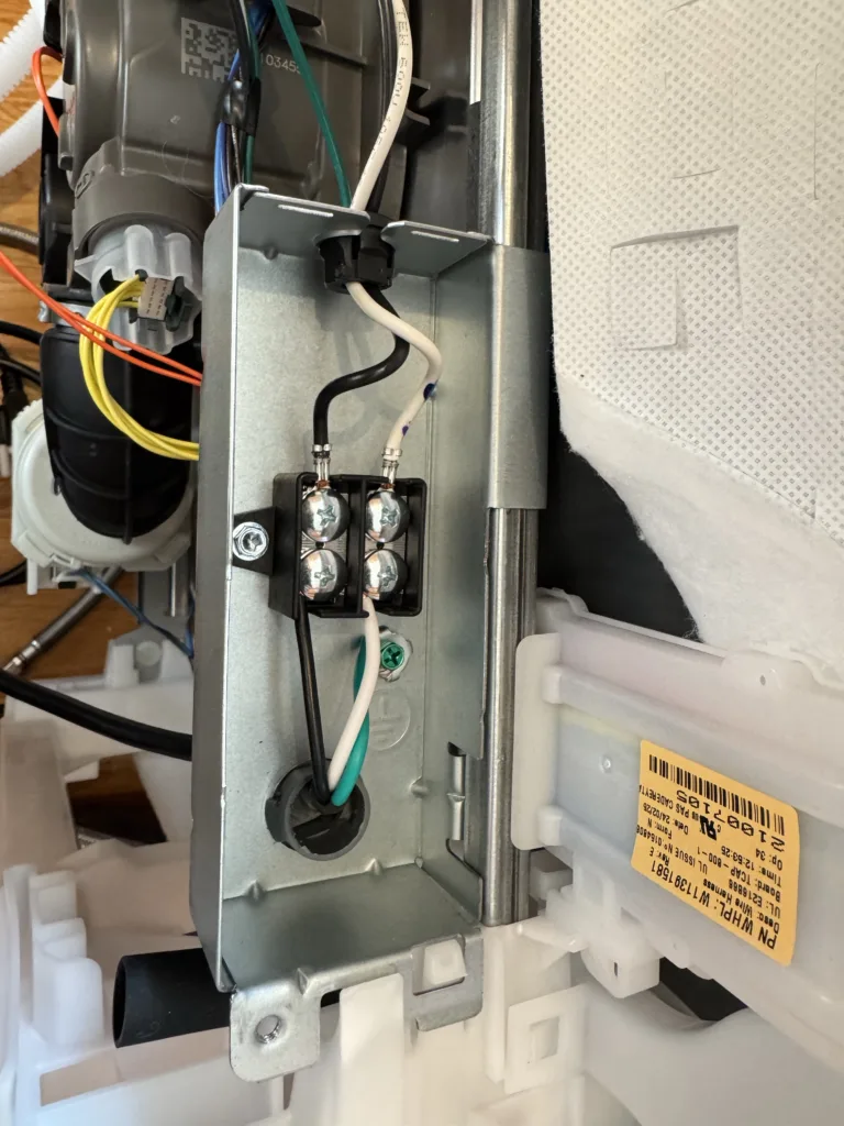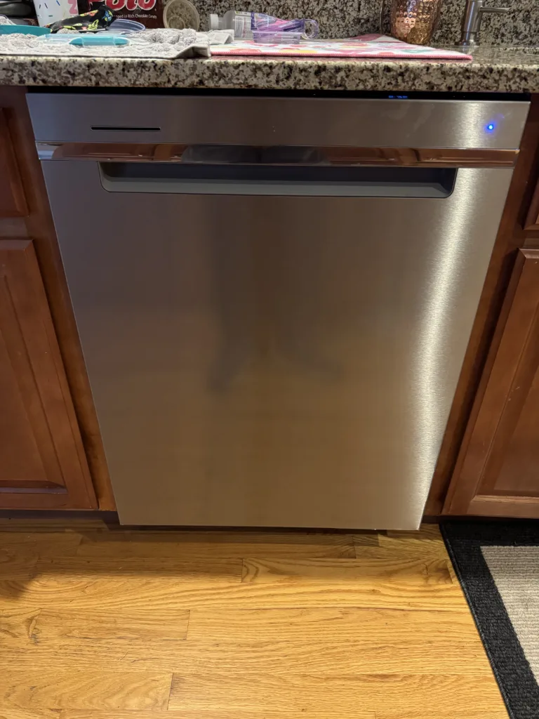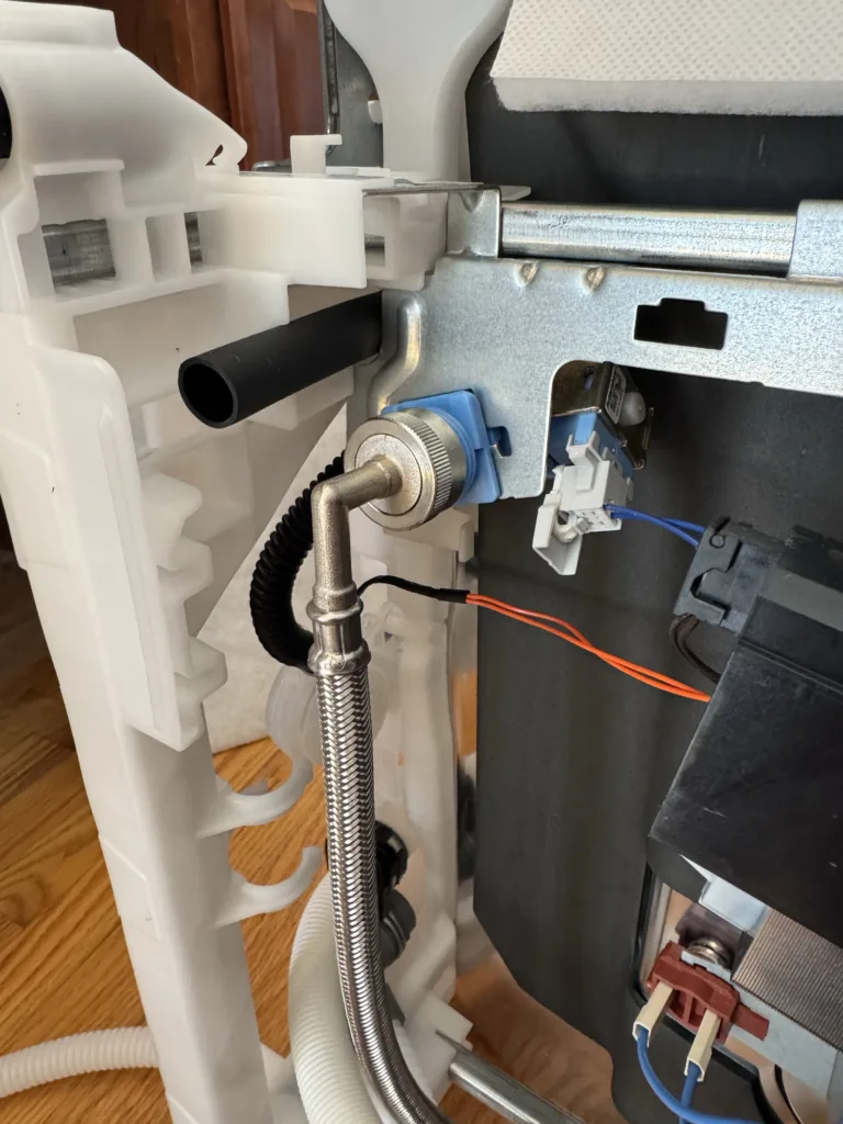 The install went smoothly overall. The trickiest part wasn’t even the plumbing—it was the cabinetry. This is at least the third dishwasher that’s been installed in this spot. The screw holes for the mounting brackets lined up perfectly with the old ones, which meant there was nothing solid left to bite into. I ended up pushing the unit about 1/4″ farther back and driving the screws in at an angle, just to avoid the stripped holes. I also had to swap out the supplied screws with slightly longer ones.