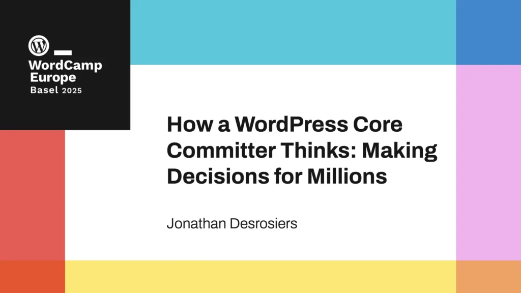 I’m currently sitting in Terminal A of Boston Logan International Airport waiting for the first leg of my journey to attend WordCamp Europe in Basel, Switzerland. In addition to the obvious reasons to be excited (seeing friends, meeting new people, checking out what everyone in the community has been building), I’m also really happy with what my presentation has grown into and can’t wait to present it. It’s not just about the decision making frameworks Core Committers use, but also a reflection on the project’s foundational philosophies and how they’ve helped the project thrive.